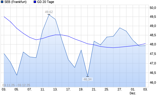 Mit dem Rücksetzer auf 47,92 EUR hat die SEB-Aktie am 02.12.2025 die 20-Tage-Linie nach unten gekreuzt.Die SEB-Aktie befindet sich seit dem 20.03.2025 im langfristigen Abwärtstrend und ...weiterlesen