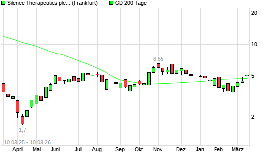 Mit dem Anstieg auf 5,30 EUR hat die SILENCE THERAPEUTICS PLC-Aktie am 09.03.2026 die 200-Tage-Linie nach oben gekreuzt.Die SILENCE THERAPEUTICS PLC-Aktie befand sich seit dem ...weiterlesen