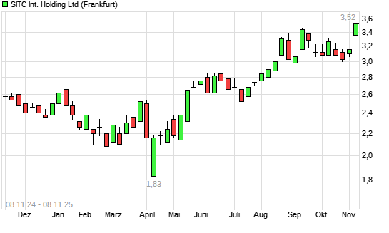 Mit dem Anstieg auf 3,42 EUR hat die SITC INTL Holding REGS-Aktie (ISIN KYG8187G1055) am 07.11.2025 ein neues 3-Jahres-Hoch erreicht und damit den Kurs vom 06.11.2025 eingestellt.Die SITC INTL ...weiterlesen