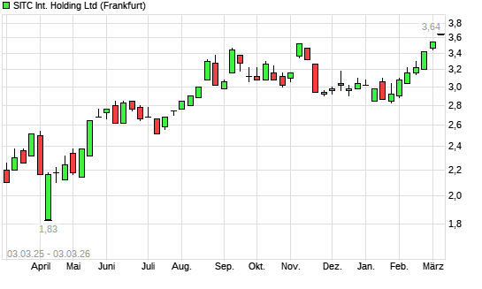 Mit dem Anstieg auf 3,64 EUR hat die SITC INTL Holding REGS-Aktie (ISIN KYG8187G1055) am 02.03.2026 ein neues 3-Jahres-Hoch erreicht und damit den Kurs vom 27.02.2026 eingestellt.Die ...weiterlesen