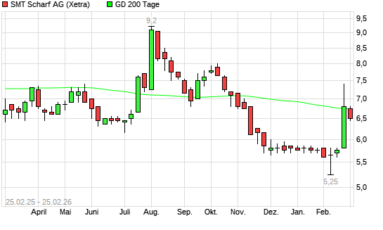 Mit dem Rücksetzer auf 6,60 EUR hat die SMT Scharf-Aktie am 24.02.2026 die 200-Tage-Linie nach unten gekreuzt.Die SMT Scharf-Aktie befand sich seit dem 19.02.2026 im ...weiterlesen
