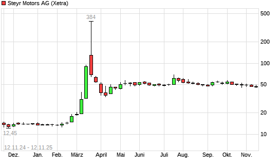 Mit dem Rücksetzer auf 45,90 EUR hat die STEYR MOTORS AG-Aktie (ISIN AT0000A3FW25) am 11.11.2025 ein neues 6-Monats-Tief erreicht und damit den Kurs vom 07.11.2025 eingestellt.Die STEYR ...weiterlesen