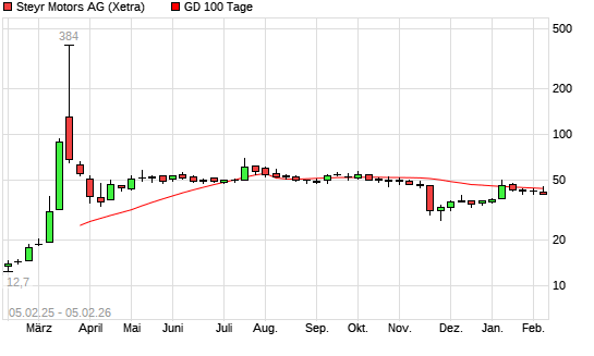 Mit dem Rücksetzer auf 41,20 EUR hat die STEYR MOTORS AG-Aktie am 04.02.2026 die 100-Tage-Linie nach unten gekreuzt.Die STEYR MOTORS AG-Aktie befindet sich seit dem 04.11.2025 im langfristigen ...weiterlesen