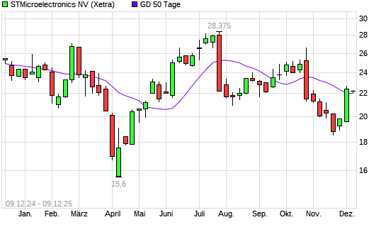 Mit dem Anstieg auf 22,12 EUR hat die STMicroelectronics-Aktie am 08.12.2025 die 50-Tage-Linie nach oben gekreuzt.Die STMicroelectronics-Aktie befindet sich seit dem 23.10.2025 im langfristigen ...weiterlesen