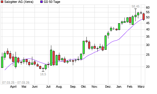 Mit dem Rücksetzer auf 47,88 EUR hat die Salzgitter-Aktie am 06.03.2026 die 50-Tage-Linie nach unten gekreuzt.Die Salzgitter-Aktie befindet sich seit dem 29.01.2025 im ...weiterlesen