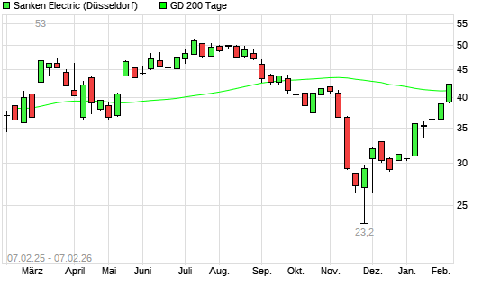 Mit dem Anstieg auf 41,80 EUR hat die Sanken-Aktie am 06.02.2026 die 200-Tage-Linie nach oben gekreuzt.Die Sanken-Aktie befand sich seit dem 26.09.2025 im langfristigen Aufwärtstrend und hat ...weiterlesen
