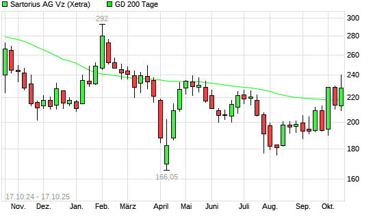 Mit dem Anstieg auf 228,40 EUR hat die Sartorius Vz-Aktie am 16.10.2025 die 200-Tage-Linie nach oben gekreuzt.Die Sartorius Vz-Aktie befand sich seit dem 08.10.2025 im langfristigen Abwärtstrend ...weiterlesen
