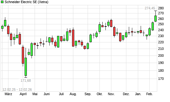 Mit dem Anstieg auf 267,05 EUR hat die Schneider Electric-Aktie (ISIN FR0000121972) am 11.02.2026 ein neues 12-Monats-Hoch erreicht und damit den Kurs vom 09.02.2026 eingestellt.Die Schneider ...weiterlesen