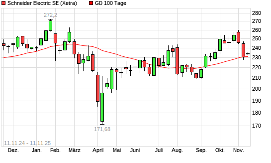 Mit dem Anstieg auf 233,80 EUR hat die Schneider Electric-Aktie am 10.11.2025 die 100-Tage-Linie nach oben gekreuzt.Die Schneider Electric-Aktie befindet sich seit dem 10.09.2025 im langfristigen ...weiterlesen