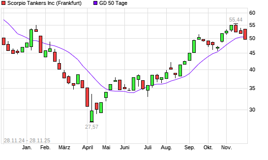 Mit dem Rücksetzer auf 49,58 EUR hat die Scorpio Tankers-Aktie am 27.11.2025 die 50-Tage-Linie nach unten gekreuzt.Die Scorpio Tankers-Aktie befindet sich seit dem 22.08.2025 im langfristigen ...weiterlesen