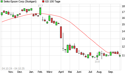 Mit dem Rücksetzer auf 10,90 EUR hat die Seiko Epson-Aktie am 03.10.2025 die 100-Tage-Linie nach unten gekreuzt.Die Seiko Epson-Aktie befindet sich seit dem 03.03.2025 im langfristigen ...weiterlesen