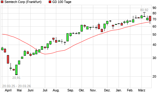 Mit dem Rücksetzer auf 63,30 EUR hat die Semtech-Aktie am 19.03.2026 die 100-Tage-Linie nach unten gekreuzt.Die Semtech-Aktie befindet sich seit dem 25.08.2025 im ...weiterlesen