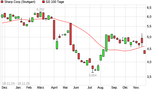 Mit dem Rücksetzer auf 4,26 EUR hat die Sharp-Aktie am 17.11.2025 die 100-Tage-Linie nach unten gekreuzt.Die Sharp-Aktie befindet sich seit dem 12.11.2025 im langfristigen Abwärtstrend ...weiterlesen