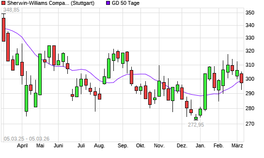Mit dem Rücksetzer auf 298,60 EUR hat die Sherwin-Williams-Aktie am 04.03.2026 die 50-Tage-Linie nach unten gekreuzt.Die Sherwin-Williams-Aktie befindet sich seit dem 03.02.2026 ...weiterlesen