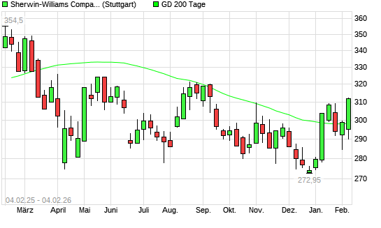 Mit dem Anstieg auf 302,35 EUR hat die Sherwin-Williams-Aktie am 03.02.2026 die 200-Tage-Linie nach oben gekreuzt.Die Sherwin-Williams-Aktie befand sich seit dem 23.01.2026 ...weiterlesen