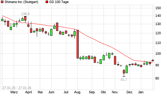 Mit dem Rücksetzer auf 92,45 EUR hat die Shimano-Aktie am 13.02.2026 die 100-Tage-Linie nach unten gekreuzt.Die Shimano-Aktie befindet sich seit dem 22.10.2024 im langfristigen Abwärtstrend ...weiterlesen