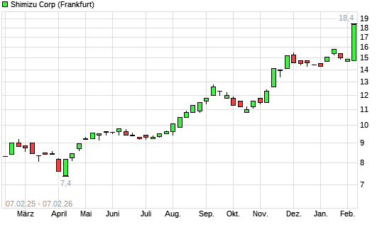 Mit dem Anstieg auf 18,40 EUR hat die Shimizu-Aktie (ISIN JP3358800005) am 06.02.2026 ein neues All-Time-High erreicht und damit den Kurs vom 05.02.2026 eingestellt.Die Shimizu-Aktie befindet ...weiterlesen