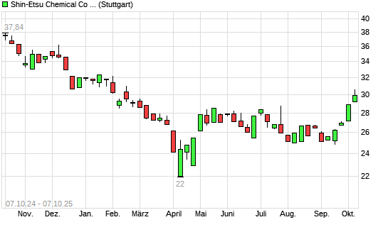 Mit dem Anstieg auf 30,61 EUR hat die Shin-Etsu Chemical-Aktie (ISIN JP3371200001) am 06.10.2025 ein neues 6-Monats-Hoch erreicht und damit den Kurs vom 03.10.2025 eingestellt.Die Shin-Etsu ...weiterlesen