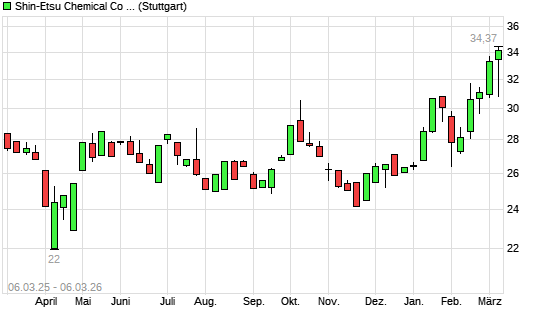 Mit dem Anstieg auf 34,63 EUR hat die Shin-Etsu Chemical-Aktie (ISIN JP3371200001) am 05.03.2026 ein neues 12-Monats-Hoch erreicht und damit den Kurs vom 27.02.2026 ...weiterlesen