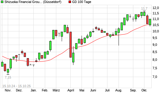 Mit dem Anstieg auf 10,90 EUR hat die Shizuoka Bank-Aktie am 14.10.2025 die 100-Tage-Linie nach oben gekreuzt.Die Shizuoka Bank-Aktie befindet sich seit dem 10.04.2025 im langfristigen Aufwärtstrend ...weiterlesen