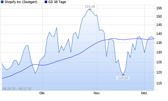 Mit dem Anstieg auf 139,42 EUR hat die Shopify-Aktie am 05.12.2025 die 38-Tage-Linie nach oben gekreuzt.Die Shopify-Aktie befindet sich seit dem 03.07.2025 im langfristigen Aufwärtstrend und ...weiterlesen