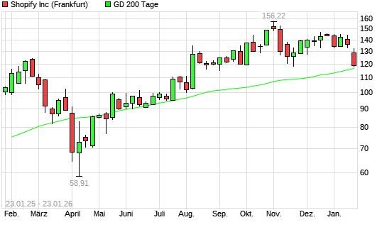 Mit dem Rücksetzer auf 118,00 EUR hat die Shopify-Aktie am 22.01.2026 die 200-Tage-Linie nach unten gekreuzt.Die Shopify-Aktie befand sich seit dem 03.07.2025 im langfristigen Abwärtstrend ...weiterlesen