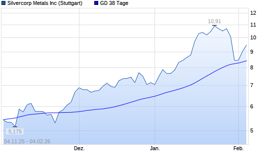 Mit dem Anstieg auf 9,01 EUR hat die Silvercorp Metals-Aktie am 03.02.2026 die 38-Tage-Linie nach oben gekreuzt.Der Abstand zur 200-Tage-Linie beträgt aktuell +70,13%. ##trendBox## Die ...weiterlesen