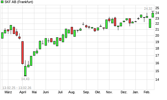 Mit dem Anstieg auf 24,32 EUR hat die Skf B-Aktie (ISIN SE0000108227) am 12.02.2026 ein neues 3-Jahres-Hoch erreicht und damit den Kurs vom 29.01.2026 eingestellt.Die Skf B-Aktie befindet sich ...weiterlesen