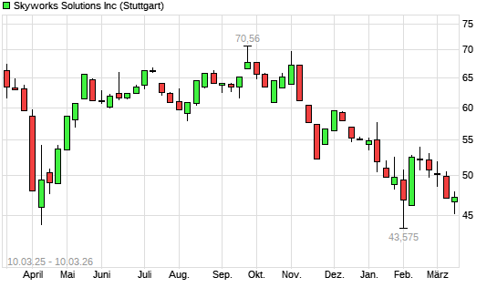 Mit dem Rücksetzer auf 45,16 EUR hat die Skyworks Solutions-Aktie (ISIN US83088M1027) am 09.03.2026 ein neues 6-Monats-Tief erreicht und damit den Kurs vom 29.01.2026 ...weiterlesen