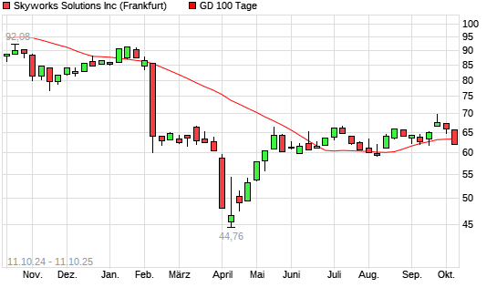 Mit dem Rücksetzer auf 62,03 EUR hat die Skyworks Solutions-Aktie am 10.10.2025 die 100-Tage-Linie nach unten gekreuzt.Die Skyworks Solutions-Aktie befindet sich seit dem 08.10.2025 im ...weiterlesen