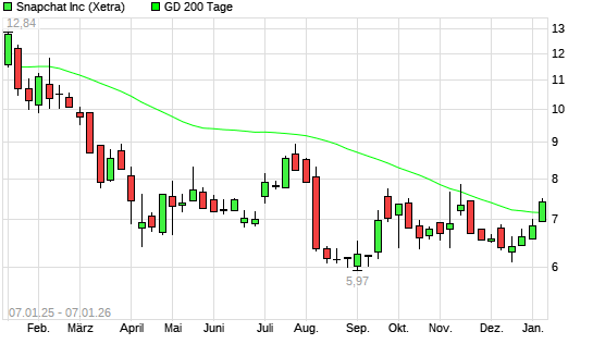 Mit dem Anstieg auf 7,42 EUR hat die Snap-Aktie am 06.01.2026 die 200-Tage-Linie nach oben gekreuzt.Die Snap-Aktie befand sich seit dem 13.11.2025 im langfristigen Aufwärtstrend und hat in diesem ...weiterlesen
