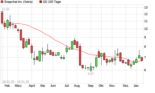 Mit dem Rücksetzer auf 6,62 EUR hat die Snap-Aktie am 15.01.2026 die 100-Tage-Linie nach unten gekreuzt.Die Snap-Aktie befindet sich seit dem 14.01.2026 im langfristigen Abwärtstrend und ...weiterlesen