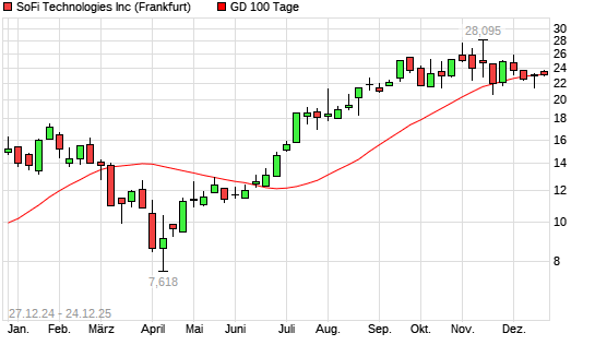 Mit dem Rücksetzer auf 23,07 EUR hat die SoFi Technologies-Aktie am 23.12.2025 die 100-Tage-Linie nach unten gekreuzt.Die SoFi Technologies-Aktie befindet sich seit dem 03.06.2025 im langfristigen ...weiterlesen