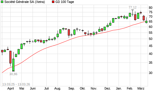 Mit dem Rücksetzer auf 65,50 EUR hat die Société Générale-Aktie am 12.03.2026 die 100-Tage-Linie nach unten gekreuzt.Die Société Générale-Aktie ...weiterlesen