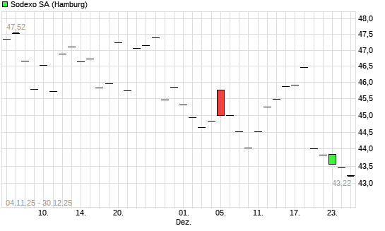 Mit dem Rücksetzer auf 43,86 EUR hat die Sodexo-Aktie am 07.01.2026 die 20-Tage-Linie nach unten gekreuzt.Die Sodexo-Aktie befindet sich seit dem 26.11.2024 im langfristigen Abwärtstrend ...weiterlesen