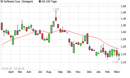 Mit dem Rücksetzer auf 1,13 EUR hat die Softbank Corp.-Aktie am 03.03.2026 die 100-Tage-Linie nach unten gekreuzt.Die Softbank Corp.-Aktie befindet sich seit dem 30.09.2025 ...weiterlesen