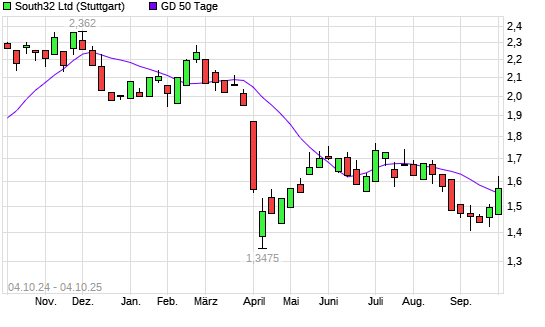 Mit dem Anstieg auf 1,61 EUR hat die South32-Aktie am 03.10.2025 die 50-Tage-Linie nach oben gekreuzt.Die South32-Aktie befindet sich seit dem 21.03.2025 im langfristigen Abwärtstrend und hat ...weiterlesen