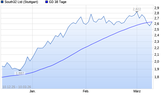 Mit dem Rücksetzer auf 2,56 EUR hat die South32-Aktie am 09.03.2026 die 38-Tage-Linie nach unten gekreuzt.Die South32-Aktie befindet sich seit dem 24.11.2025 im ...weiterlesen