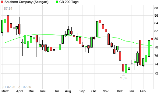 Mit dem Anstieg auf 80,43 EUR hat die Southern Company-Aktie am 20.02.2026 die 200-Tage-Linie nach oben gekreuzt.Die Southern Company-Aktie befand sich seit dem 17.02.2026 im ...weiterlesen