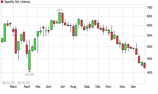 Mit dem Rücksetzer auf 415,50 EUR hat die Spotify Technology-Aktie (ISIN LU1778762911) am 29.01.2026 ein neues 12-Monats-Tief erreicht und damit den Kurs vom 28.01.2026 eingestellt.Die ...weiterlesen