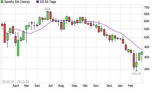 Mit dem Anstieg auf 435,10 EUR hat die Spotify Technology-Aktie am 27.02.2026 die 50-Tage-Linie nach oben gekreuzt.Die Spotify Technology-Aktie befindet sich seit dem 31.10.2025 ...weiterlesen
