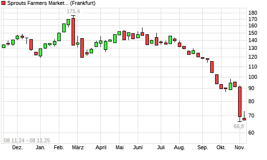 Mit dem Rücksetzer auf 67,30 EUR hat die Sprouts Farmers Market-Aktie (ISIN US85208M1027) am 07.11.2025 ein neues 12-Monats-Tief erreicht und damit den Kurs vom 30.10.2025 eingestellt.Die ...weiterlesen