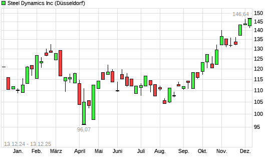 Mit dem Anstieg auf 146,10 EUR hat die Steel Dynamics-Aktie (ISIN US8581191009) am 04.12.2025 ein neues All-Time-High erreicht und damit den Kurs vom 07.11.2024 eingestellt.Die Steel Dynamics-Aktie ...weiterlesen