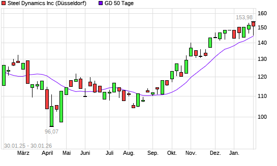 Mit dem Rücksetzer auf 144,72 EUR hat die Steel Dynamics-Aktie am 29.01.2026 die 50-Tage-Linie nach unten gekreuzt.Die Steel Dynamics-Aktie befindet sich seit dem 17.09.2025 im langfristigen ...weiterlesen
