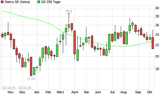 Mit dem Rücksetzer auf 22,50 EUR hat die Steico-Aktie am 09.10.2025 die 200-Tage-Linie nach unten gekreuzt.Die Steico-Aktie befand sich seit dem 25.06.2025 im langfristigen Abwärtstrend ...weiterlesen