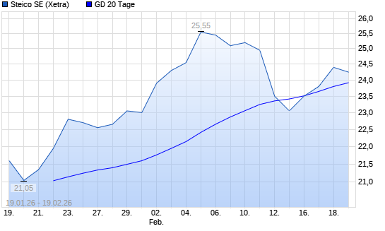 Mit dem Anstieg auf 24,00 EUR hat die Steico-Aktie am 18.02.2026 die 20-Tage-Linie nach oben gekreuzt.Die Steico-Aktie befindet sich seit dem 23.01.2026 im langfristigen Aufwärtstrend ...weiterlesen