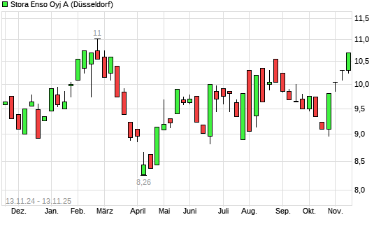Mit dem Anstieg auf 10,75 EUR hat die Stora Enso-Aktie (ISIN FI0009005953) am 12.11.2025 ein neues 6-Monats-Hoch erreicht und damit den Kurs vom 25.08.2025 eingestellt.Die Stora Enso-Aktie befindet ...weiterlesen