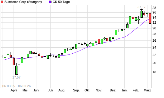 Mit dem Rücksetzer auf 33,14 EUR hat die Sumitomo-Aktie am 05.03.2026 die 50-Tage-Linie nach unten gekreuzt.Die Sumitomo-Aktie befindet sich seit dem 23.04.2025 im ...weiterlesen