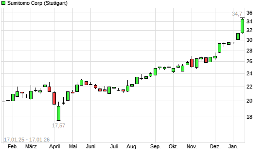 Mit dem Anstieg auf 34,77 EUR hat die Sumitomo-Aktie (ISIN JP3404600003) am 16.01.2026 ein neues All-Time-High erreicht und damit den Kurs vom 15.01.2026 eingestellt.Die Sumitomo-Aktie befindet ...weiterlesen