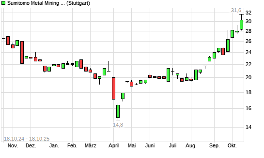 Mit dem Anstieg auf 32,00 EUR hat die Sumitomo Metal Mining-Aktie (ISIN JP3402600005) am 17.10.2025 ein neues 12-Monats-Hoch erreicht und damit den Kurs vom 09.10.2025 eingestellt.Die Sumitomo ...weiterlesen